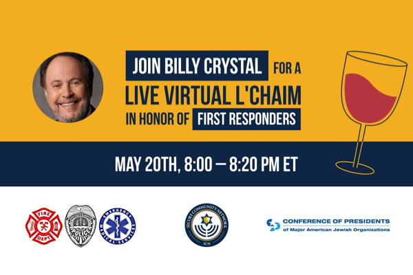 Join Billy Crystal and the Secure Community Network (SCN) for a Live Virtual L'Chaim in honor of the first responders protecting our communities during the COVID-19 crisis.