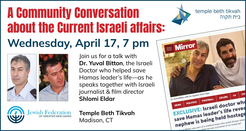 Please note that all events offered by the Jewish Federation, Foundation, and JCC of Greater New Haven may include photography. Photos taken at events may be used in our social media, websites, and in print materials to support the objectives of our organizations and to promote future events. We respect our patrons' privacy. If you do not wish to be photographed, please let us know at the event registration and welcome desk.