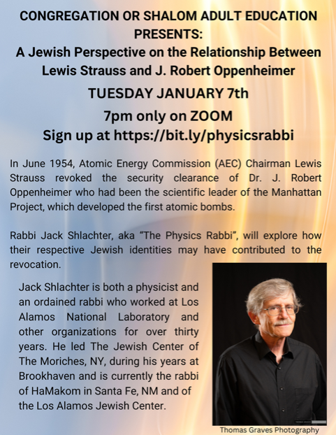 Jack Shlachter is both a physicist and an ordained rabbi who worked at Los Alamos National Laboratory and other organizations for over thirty years. He led The Jewish Center of The Moriches, NY, during his years at Brookhaven and is currently the rabbi of HaMakom in Santa Fe, NM and of the Los Alamos Jewish Center.