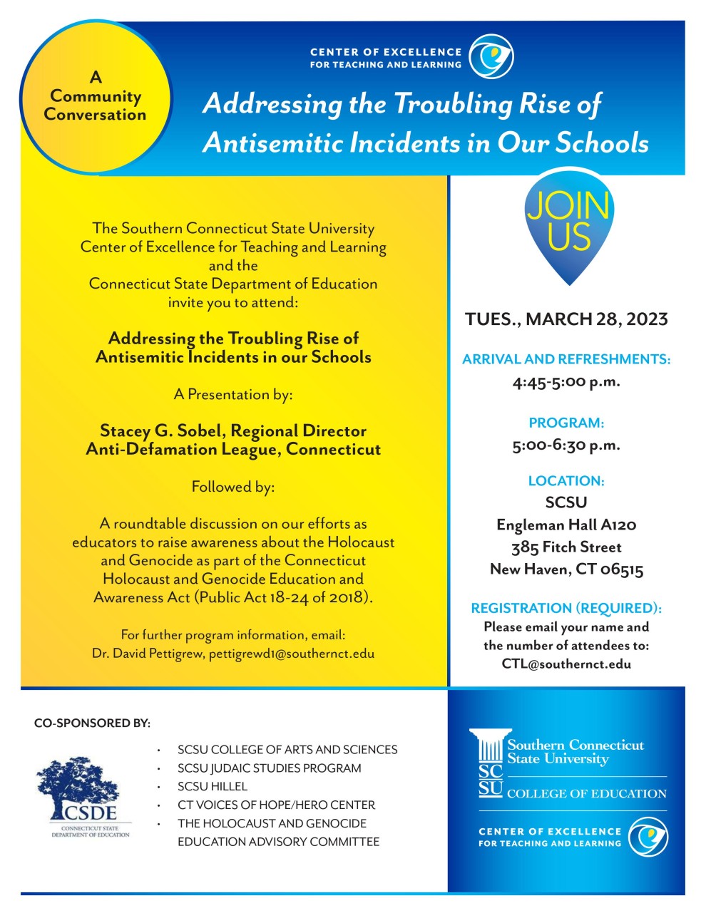 The Southern Connecticut State University Center of Excellence for Teaching and Learning; SCSU College of Education; SCSU College of Arts and Sciences; SCSU Judaic Studies Program; SCSU Hillel; Connecticut Voices of Hope/HERO Center; the Connecticut State Department of Education; and the Holocaust and Genocide Education Advisory Committee