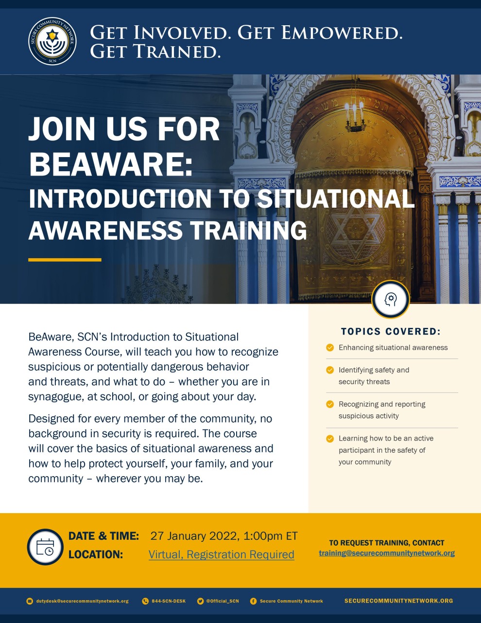 BeAware, SCN’s Introduction to Situational Awareness Course, will teach you how to recognize suspicious or potentially dangerous behavior and threats, and what to do – whether you are in synagogue, at school, or going about your day.