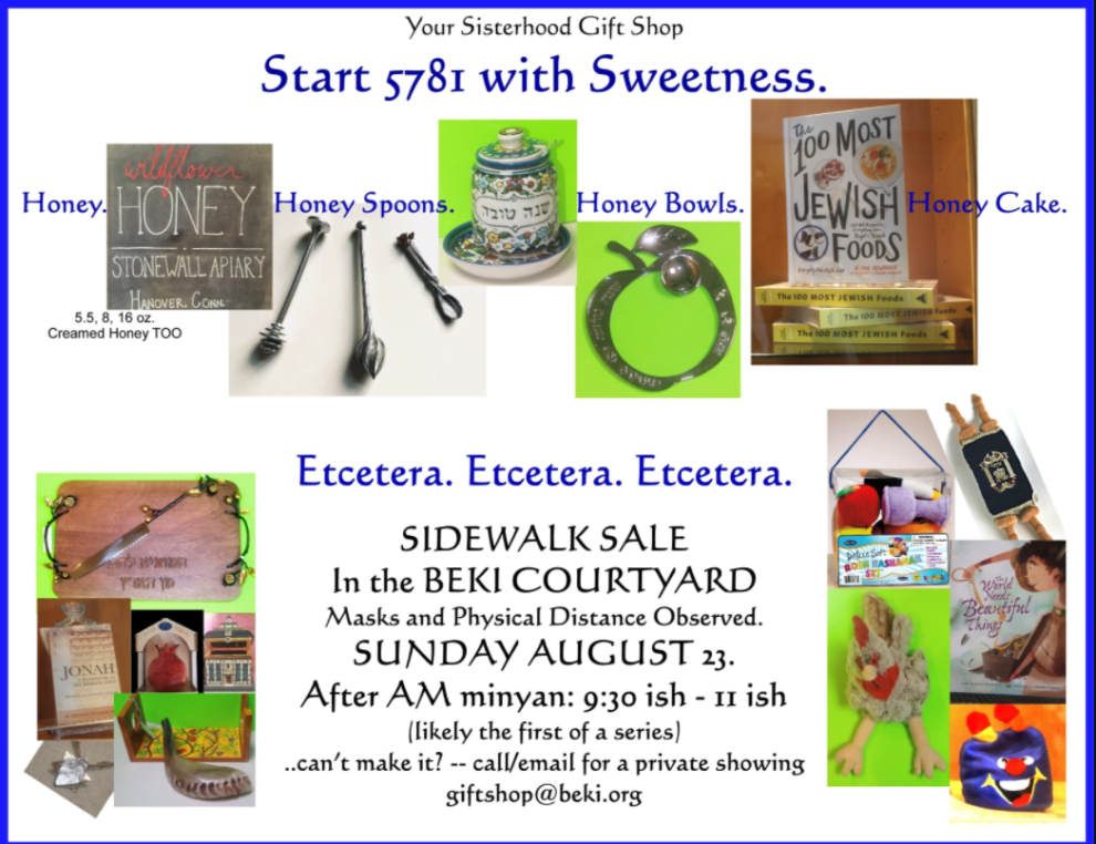 Been cooped up too long? Come out to our safely distanced courtyard BEKI Giftshop sale. Time to add some sparkle to your home for Rosh HaShanah: Honeyspoons, honey, honeypots, a honey of a necklace or two, plush Torahs and other wonderful surprises. In the Harrison Street Courtyard. After morning minyan ~9:45ish - 11am. Rain date 30 August