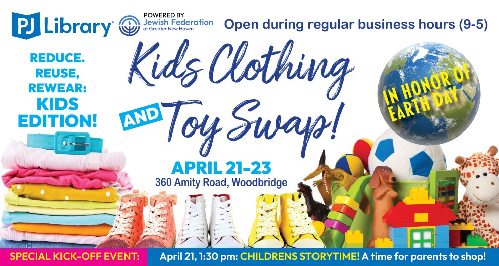 Special Kick-Off Event: Bring the kids to join us on Monday, April 21 at 1:30–2:00 PM in the Family Center for a PJ Library Storytime! With the kids happily engaged, parents have the opportunity to browse the swap with ease.