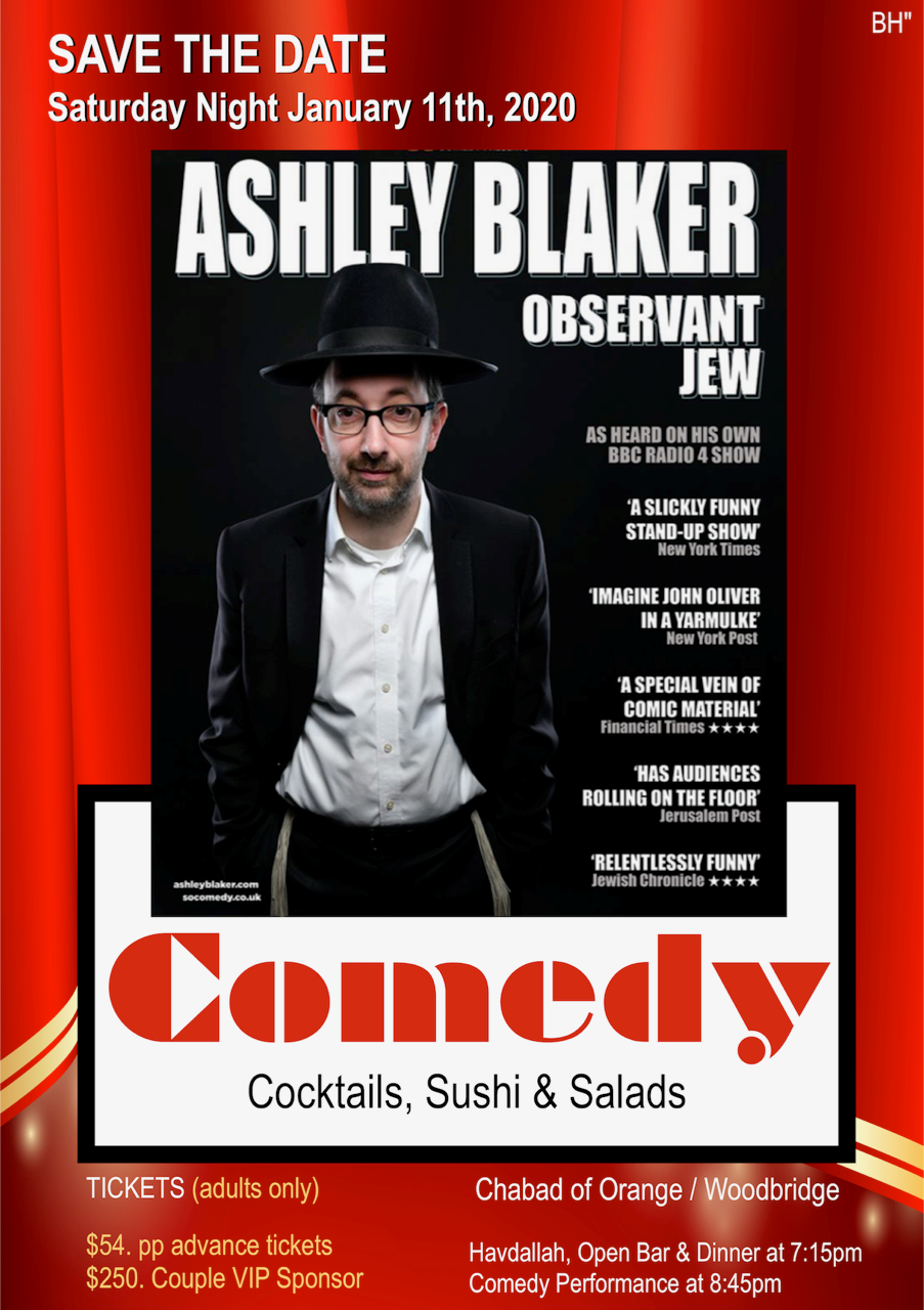 Ashley Blaker is an internationally acclaimed comedian, seen and heard on TV and radio across the world. He has performed on five continents including tours of the UK, USA, Canada, South Africa, Israel and Australia. His five week run Off-Broadway begins in February and Chabad of Orange Woodbridge is delighted to have booked him prior to his opening.