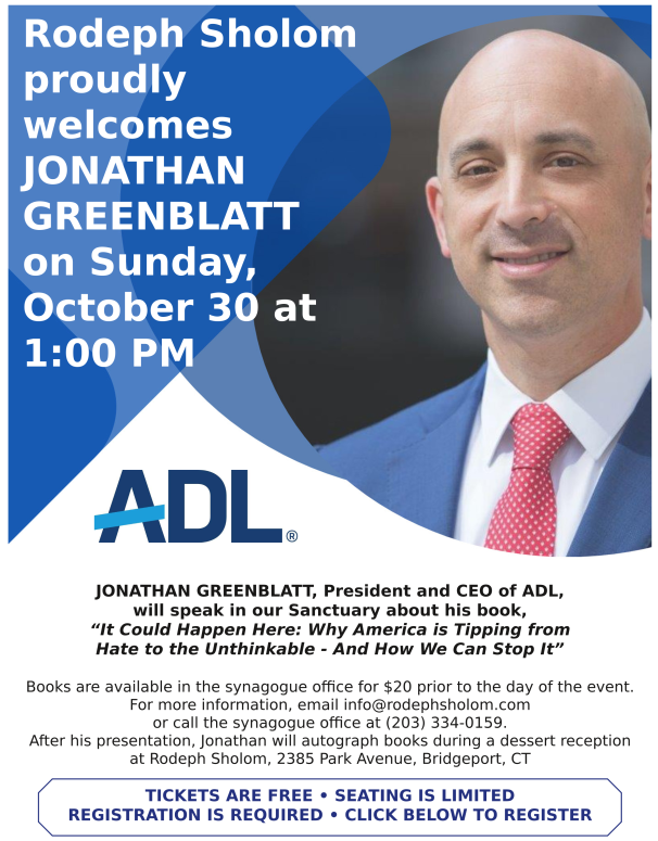 Rodeph Sholom is very excited to welcome Chief Executive Officer at the Anti-Defamation League, Jonathan Greenblatt, back to the synagogue where he celebrated his Bar Mitzvah. The program will be held on October 30, 2022 at 1 p.m.
