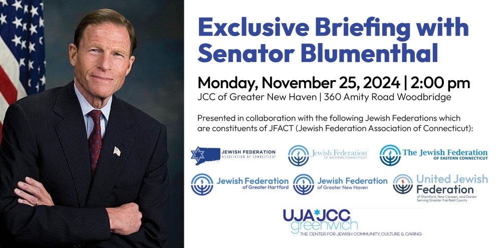 Please join JFACT and Jewish Federations across the state at the JCC of Greater New Haven, 360 Amity Road Woodbridge, on Monday, November 25th at 2:00pm to hear directly from Senator Blumenthal.