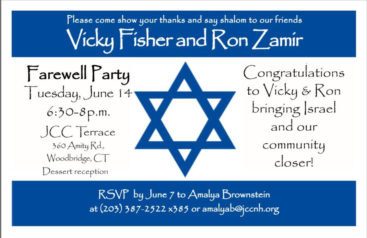 Please come and show your thanks and say shalom to our special friends, Vicky Fisher and Ron Zamir, our Israeli Emissaries.