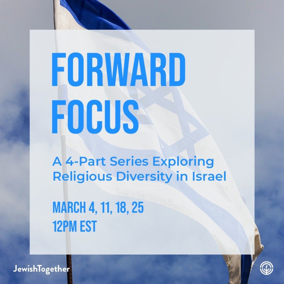 Register in advance. Forward Focus is a four-part educational series that explores the importance and development of religious pluralism in Israel. Over the course of four days, experts, religious leaders, and changemakers will discuss the growing prevalence of practicing Judaism within the religious and cultural framework, but outside traditional norms.