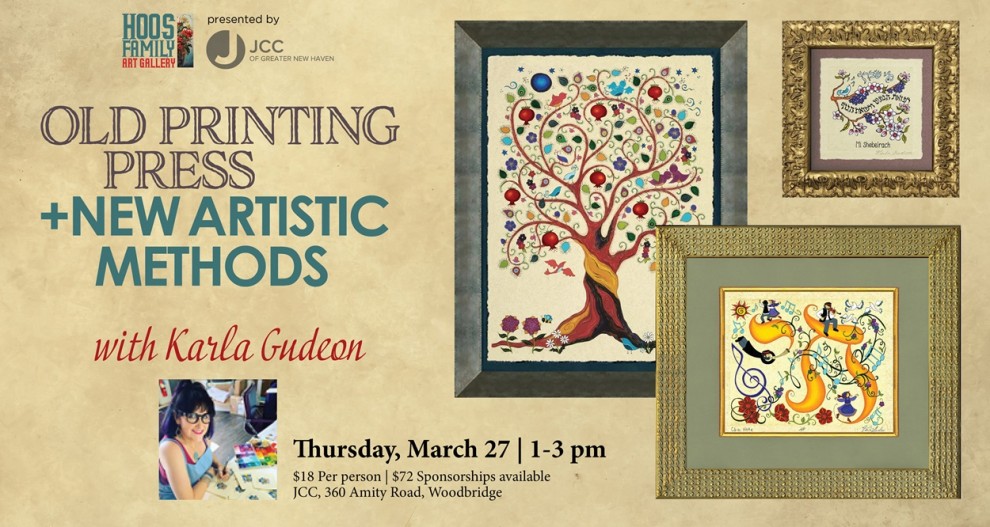 In conjunction with the concurrent 3 person photography exhibit in the Hoos Family Art Gallery, The JCC is offering a fun art activity with professional Judaic artist, Karla Gudeon. Karla's artistic process is quite unique. We will learn about her inspiration, her technique, and a bit about Karla herself.