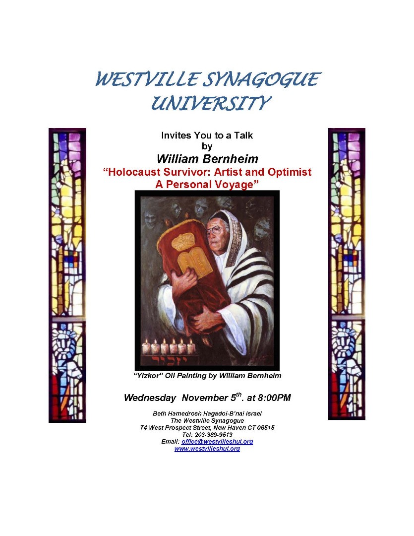 This Wednesday, we have an exceptional opportunity to hear a Holocaust survivor tell his story of tragedy and triumph. William Bernheim experienced the most harrowing and devastating abuse at the hands of the Nazis and with courage, wisdom, resolve, and humor, was able to turn his life around. A gifted artist, Mr, Bernheim channeled his pain using his creative talents into constructive ends. His story is compelling and his message is necessary to hear. We will have fewer and fewer opportunities to listen to first-hand accounts of the Holocaust.