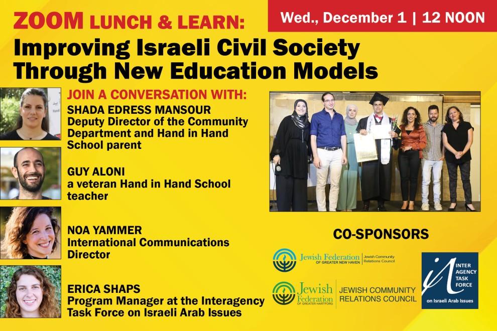 Join us on December 1 at 12:00pm ET for a conversation with Shada Edress Mansour, Deputy Director of the Community Department and Hand in Hand School parent, Guy Aloni, a veteran Hand in Hand School teacher, Noa Yammer, International Communications Director, and Erica Shaps, Program Manager at the Interagency Task Force on Israeli Arab Issues.