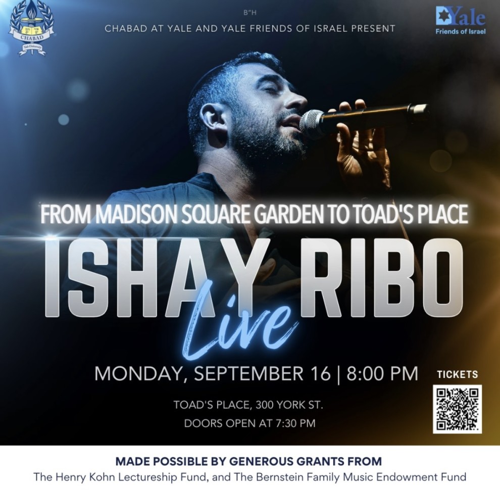 From Madison Square Garden to Toad's Place! Ishay Ribo, live in concert. Hosted by Chabad at Yale x Yale Friends of Israel. Sponsored By Chabad at Yale University and Yale Friends of Israel. Made possible by generous grants from The Henry Kohn Lectureship Fund and The Bernstein Family Music Endowment Fund.