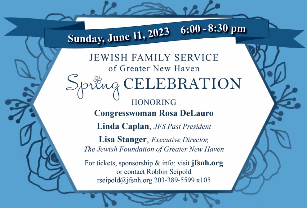 You’re Invited! Jewish Family Service of Greater New Haven (JFS) Spring Celebration on Sunday, June 11, 2023, from 6:00 to 8:30 p.m., at the Jewish Community Center in Woodbridge. This event is critical to funding vital JFS programming, which supports and strengthens individual, family, and community life by providing a wide range of social services in Greater New Haven.