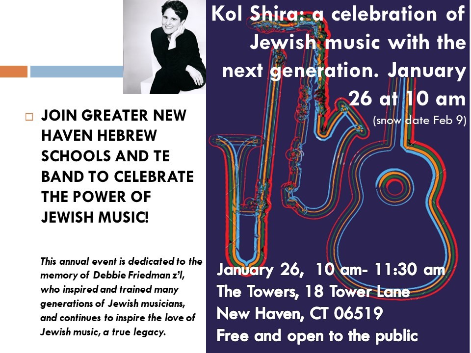 Religious school students and teachers, rabbis, cantors, cantorial soloists and instrumentalists from eight area synagogues will come together on Sunday, January 26 at 10:00 am, for a morning of singing in celebration of the power of Jewish music. The concert, which will take place at The Towers, 18 Tower Lane, New Haven, is free and open to the public. Please bring your friends and your voices and RSVP to The Towers at 203-772-1816 if you plan to attend.