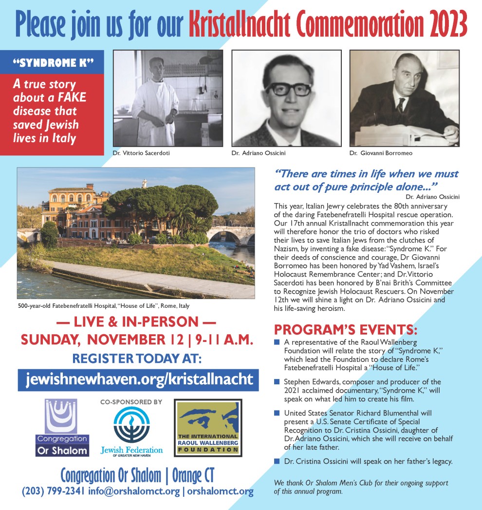 This year, Italian Jewry celebrates the 80th anniversary of the daring Fatebenefratelli Hospital rescue operation. Our 17th annual Kristallnacht commemoration this year will therefore honor the trio of doctors who risked their lives to save Italian Jews from the clutches of Nazism, by inventing a fake disease: “Syndrome K.” For their deeds of conscience and courage, Dr Giovanni Borromeo has been honored by Yad Vashem, Israel’s Holocaust Remembrance Center; and Dr. Vittorio Sacerdoti has been honored by B’nai Brith’s Committee to Recognize Jewish Holocaust Rescuers. On November 12th we will shine a light on Dr. Adriano Ossicini and his life-saving heroism.