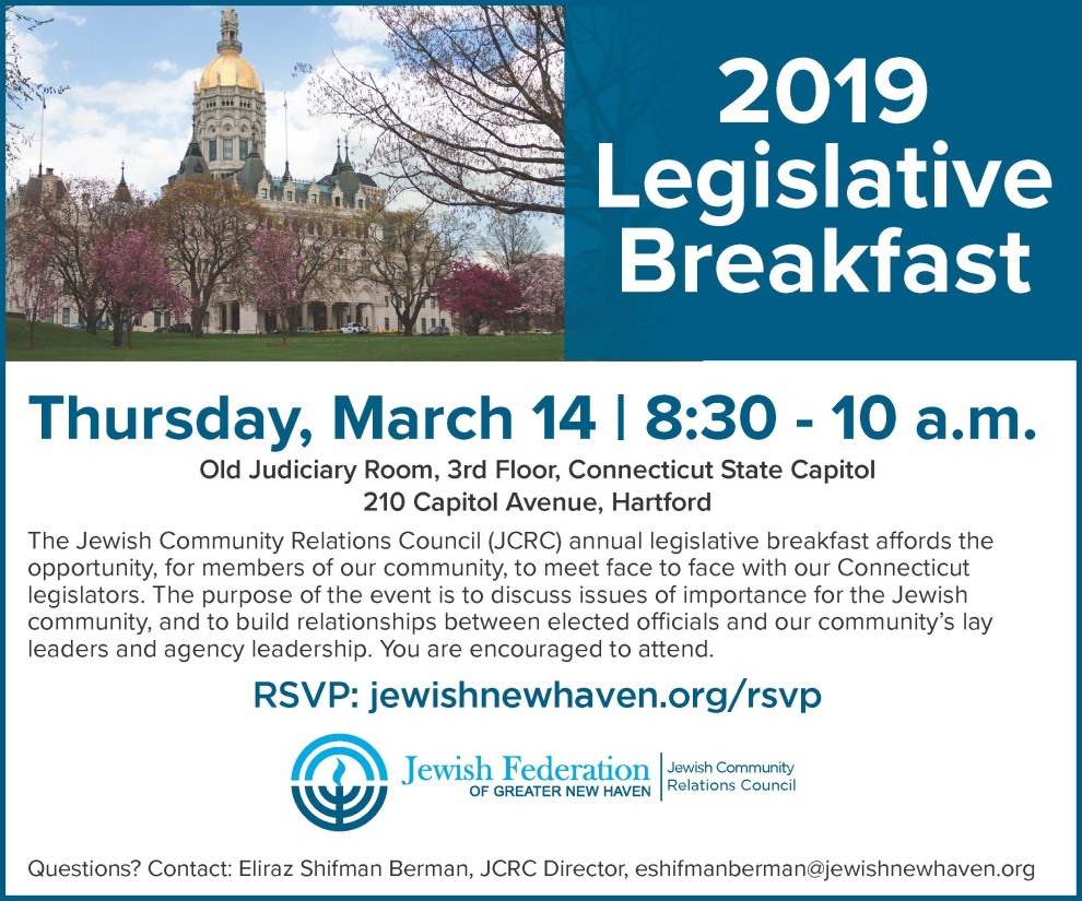The Jewish Community Relations Council (JCRC) annual legislative breakfast affords the opportunity, for members of our community, to meet face to face with our Connecticut legislators. The purpose of the event is to discuss issues of importance for the Jewish community, and to build relationships between elected officials and our community’s lay leaders and agency leadership. You are encouraged to attend.