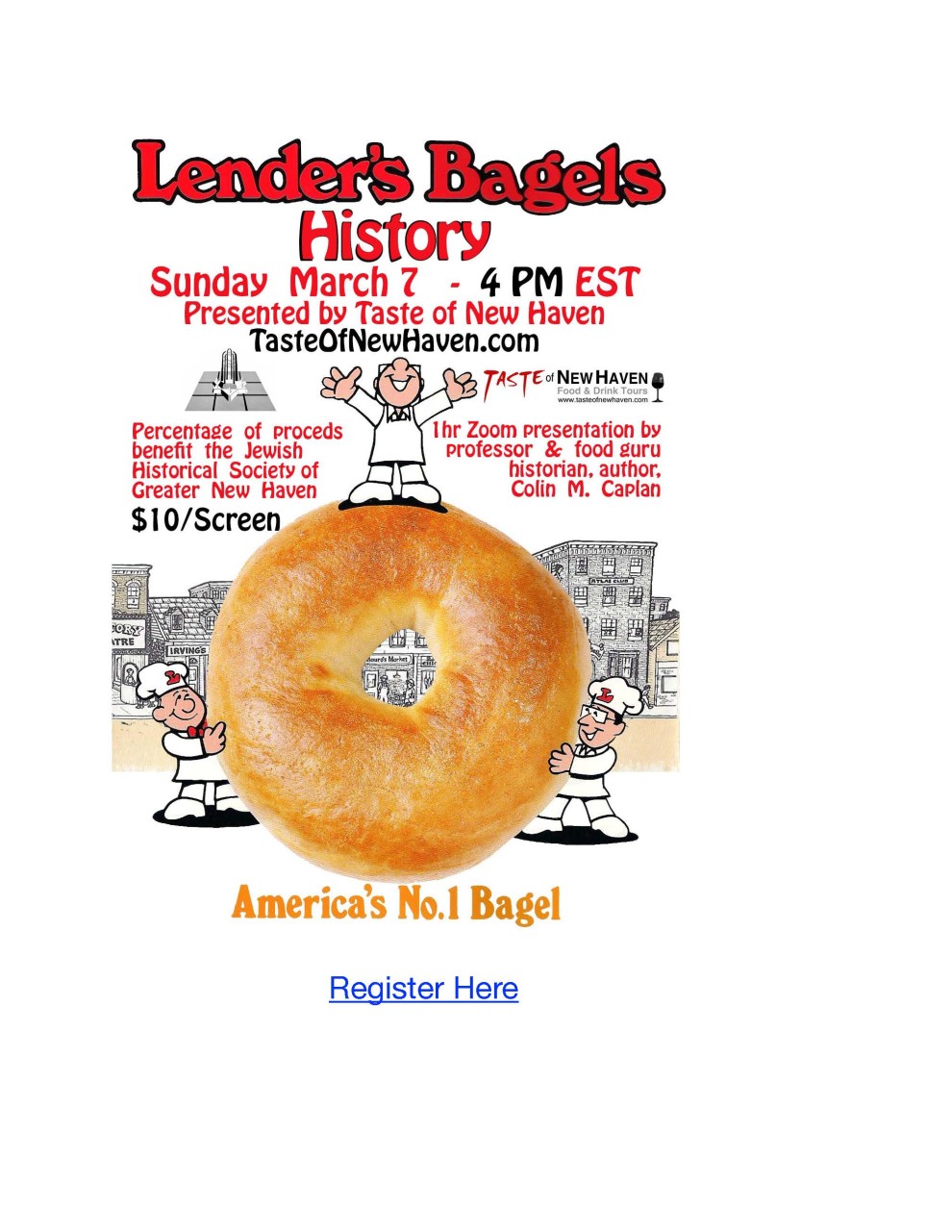 Register in advance. Join historian and food guru Colin M. Caplan on a virtual journey into the history of the storied Lender's Bagels from the family's roots in Poland to the streets of New Haven and onto the freezers of America's households. This illustrated and narrated presentation will be held on Zoom providing safe, easy access to view and hear history come alive from your home. The legendary Marvin Lender will be joining us for a Q&A afterward!