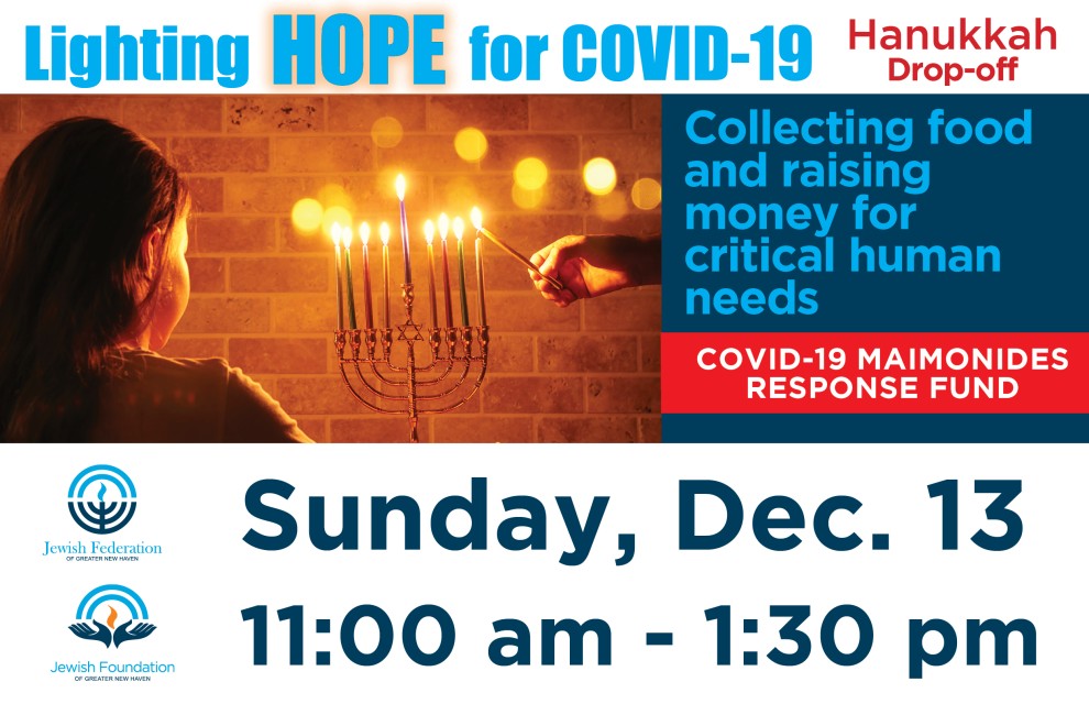 As we light the menorah this Hanukkah, let us also light hope for the members of our community who have been affected by COVID-19. This holiday season, many households are struggling to put food on the table and keep a roof over their heads. To support those in need, the Jewish Federation and Jewish Foundation of Greater New Haven are running a drop-off food drive and appeal on Sunday, December 13 from 11 AM-1:30 PM. Drop off food for the Jewish Family Service of Greater New Haven (JFS) food pantry and/or make a donation to the COVID-19 Maimonides Response Fund. For food pantry donations, JFS is requesting oatmeal, cereal, peanut butter, white tuna, and canned or dry beans.