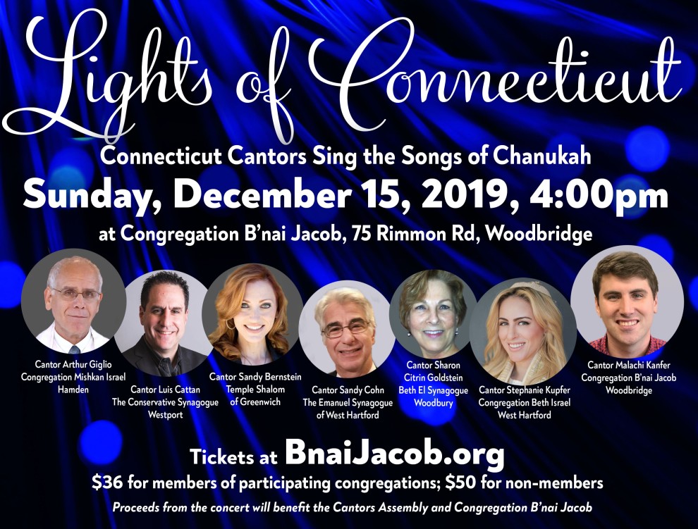 This wonderful holiday musical event will feature Cantors Sandy Bernstein of Temple Shalom of Greenwich, Luis Cattan of the Westport Synagogue, Sanford Cohn of The Emanuel Synagogue in West Hartford, Sharon Goldstein of Beth El Synagogue in Woodbury and Malachi Kanfer of Congregation B’nai Jacob in Woodbridge.