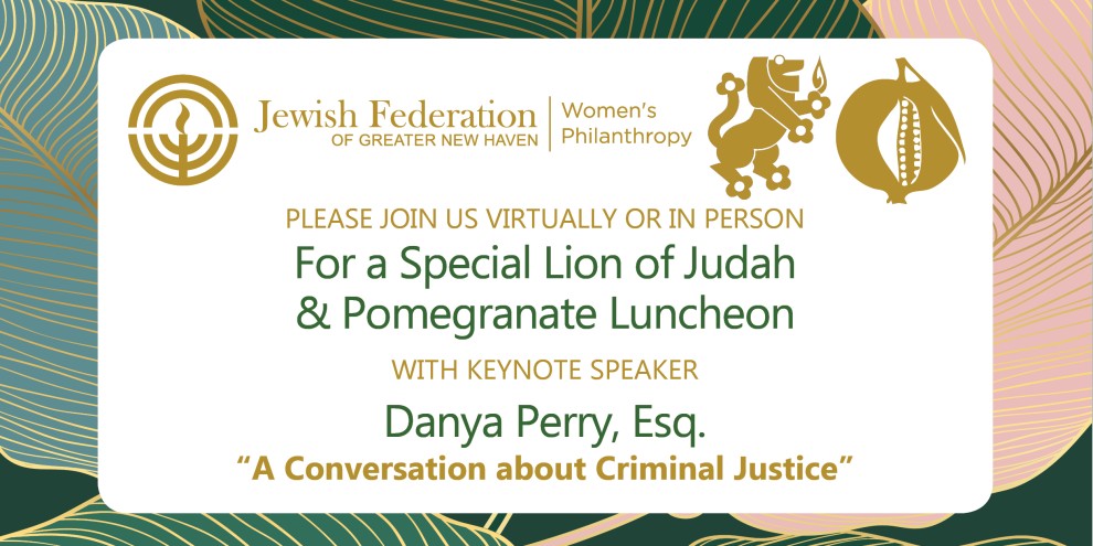Register for this event in advance. Please Join Women's Philanthropy, virtually or in person, for a Special Lion of Judah & Pomegranate Luncehon with Keynote Speaker Danya Perry, Esq. to discuss "A conversation about criminal justice”