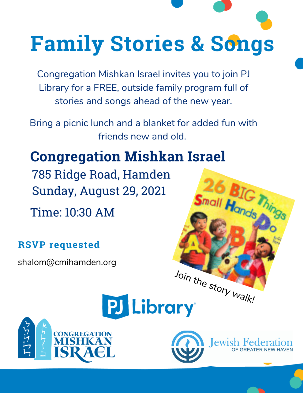 Congregation Mishkan Israel invites you to join PJ Library for a FREE family program outdoors, full of stories and songs ahead of the new year. All are welcome.
