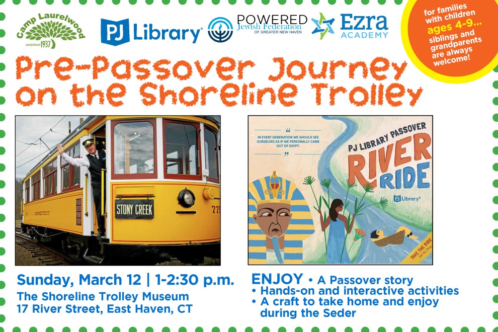 Join Camp Laurelwood, Ezra Academy & PJ Library for a pre-Passover journey. Take a trolley ride with us to learn the Passover story with multiple hands-on and interactive activities and a craft to take home and enjoy during the Seder.