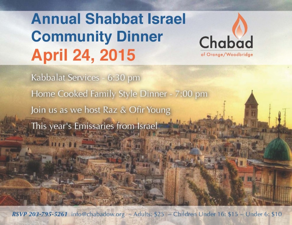Please join us Friday April 24th for our annual Shabbat Israel Community Dinner! Enjoy a delicious home cooked Israeli Shabbat meal and spend a spirited fun filled evening - Israeli style! Our special guests from Israel - this year's emissaries from Israel - Raz & Ofir Young ~ will be there to help us wish Israel a Happy Birthday!