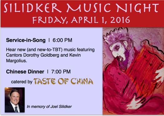 Cantor Kevin Margolius and special guest Dorothy Goldberg will lead Temple Beth Tikvah in song to celebrate the life of Joel Silidker who loved being together singing, laughing, joking, eating and living with friends and family. He understood the power of being together, and, in the loss of his own mother, he helped TBT create a special musical weekend in which we could all sing, laugh, and celebrate together. When Joel was unexpectedly taken from us, we commemorated him with a weekend he created. Circumstances change, but our desire to keep Joel’s memory and spirit alive and with us has not changed. Hear new (and new-to-TBT) Shabbat music, followed by a Chinese Dinner by TASTE OF CHINA.