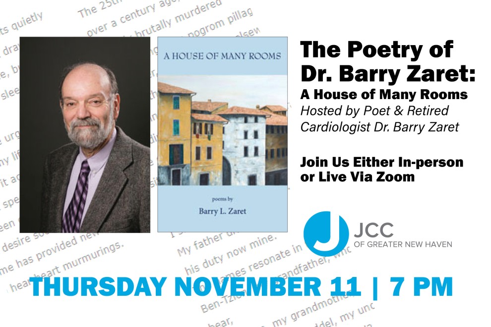 Register in advance. A House of Many Rooms is Barry Zaret's third published book of poetry. The poems touch on a wide variety of topics including Judaism, responses to Covid, community and much more. The title derives from a Talumdic source. If you've attended one of Barry's poetry readings in the past you know that this is not to be missed. If you've never heard Barry present his poetry, please don't miss this opportunity for an extraordinary evening.