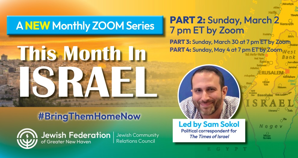 A new Zoom series presented by the Jewish Federation of Greater New Haven and Temple Beth Sholom of Hamden. An analysis and discussion of current events in Israel led by Sam Sokol, political correspondent for The Times of Israel.
