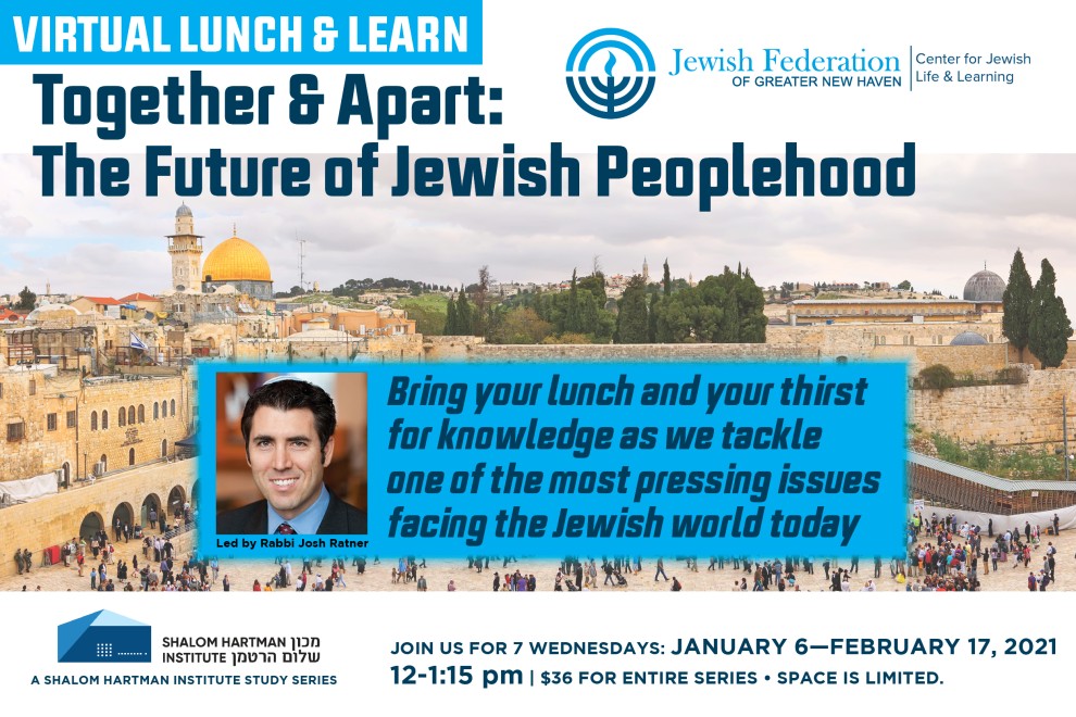 This exciting series will address the complex features of Jewish peoplehood inherent in our tradition and in our history. Each session will examine new challenges to our unity including nationalism, antisemitism, dual loyalty, and identity politics. Join us as we consider what it means to be a member of the Jewish people, the core values that animate Jewish peoplehood, and contemporary challenges to Jewish unity. We will explore new conceptual frameworks to help sustain and grow the story of our people for a new millennium.