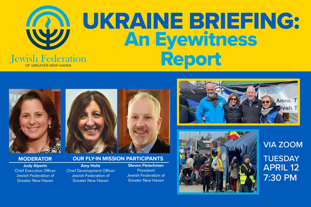 Join Jewish Federation of Greater New Haven President Dr. Steven Fleischman and Chief Development Officer Amy Holtz for a post-trip briefing on their recent emergency fly-in to the Ukraine-Poland border. They will share their firsthand accounts of the ongoing refugee crisis and what Federation and its on-the-ground partners are doing to aid Ukrainian refugees in need.