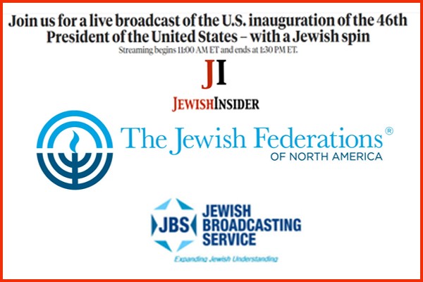 The Jewish Federations of North America (JFNA) is partnering with the Jewish Broadcast Service and Jewish Insider to bring the Jewish world exclusive coverage of the inauguration ceremony of President Joe Biden and Vice President Kamala Harris on January 20, 2021. The televised event, which will be hosted by JFNA’s President and CEO Eric Fingerhut and Jewish Insider’s Managing Editor Melissa Weiss, can be viewed on television in homes across the U.S. that transmit DirectTV, Comcast, and other carriers and on Jewish Insider at www.jewishinsider.com/JFNA Streaming begins 11:00 AM ET and ends at 1:30 PM ET – with ceremony and swearing-in around noon.