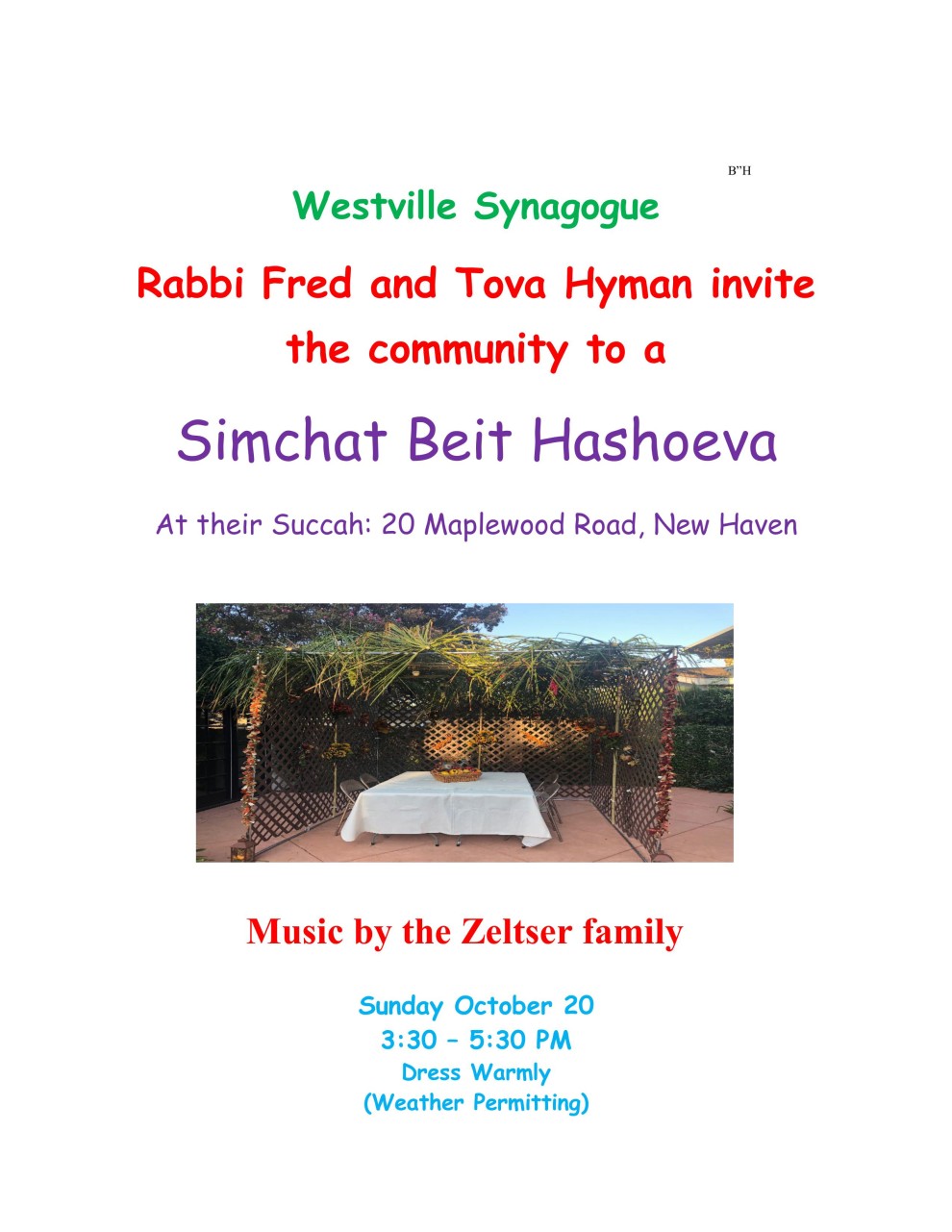 Rabbi Fred and Tova Hyman invite the community to a Simchat Beit Hashoeva at their Succah: 20 Maplewood Road, New Haven. Music by the Zeltser family