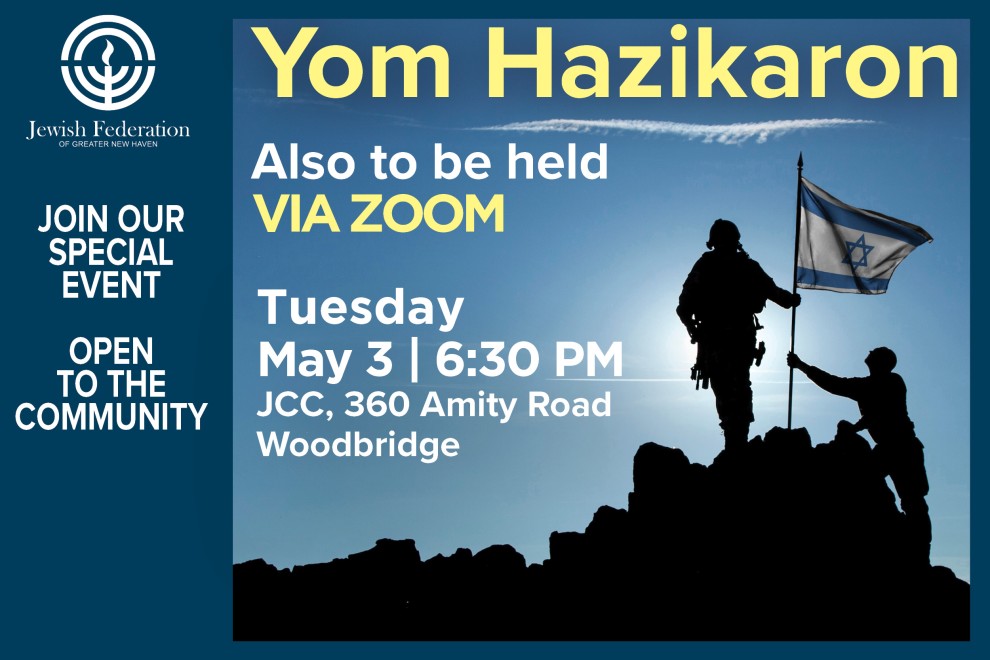You are invited to a Greater New Haven Community Yom Hazikaron Ceremony for fallen IDF soldiers and victims of terror, led by Tal and Yoav from Israel at Your Doorstep.
