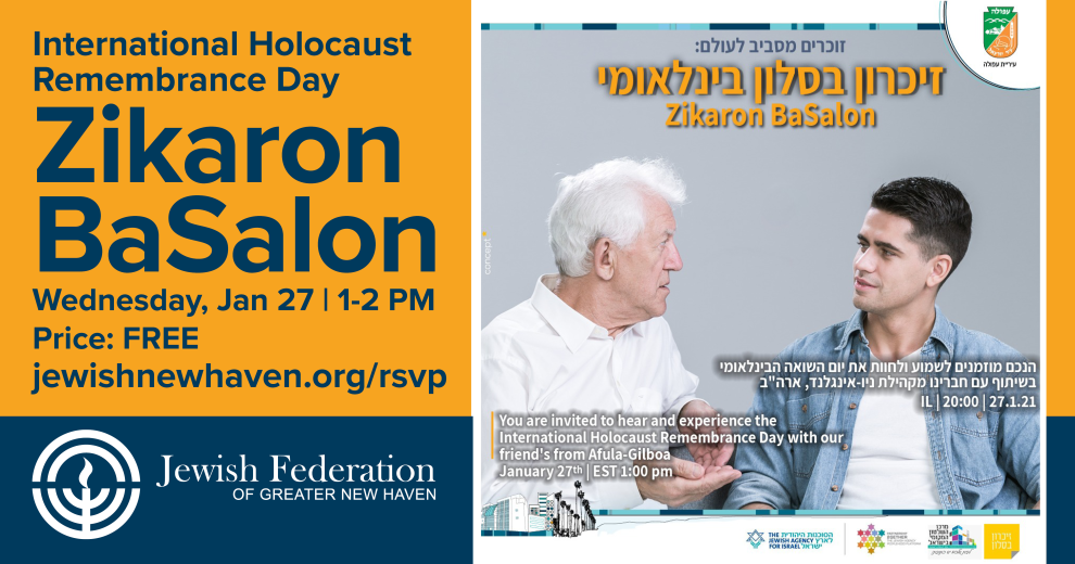 Register in advance. "Zikaron BaSalon", meaning "remembrance in the living room" in Hebrew, is an imitative which started a decade ago in Israel. Holocaust survivors were invited to people's living room to an intimate and personal meeting to share their survival story. Now, through our partnership with Afula-Gilboa in Israel, we can be a part of it. The survivals will speak in English.