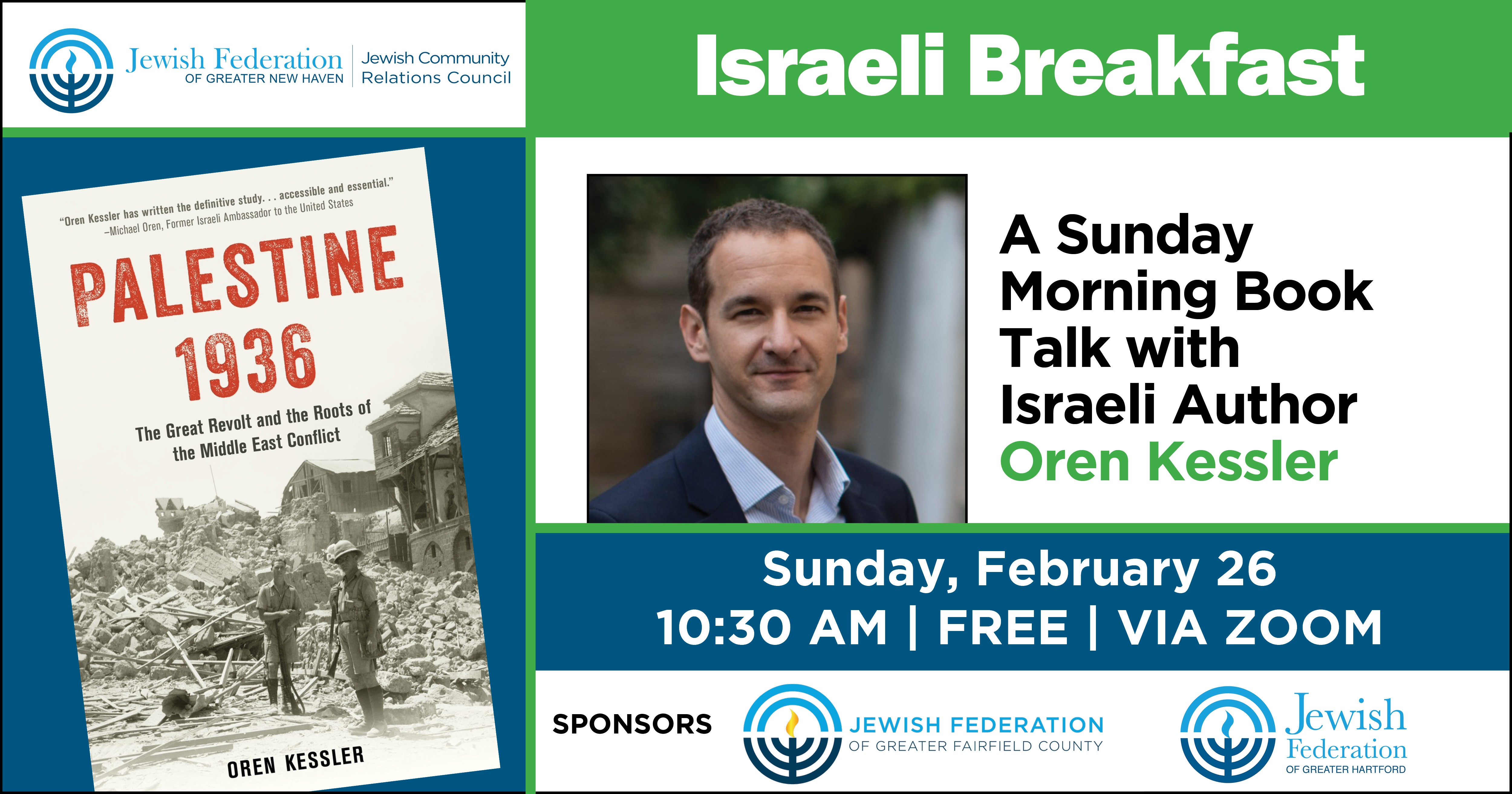 Join us on Sunday, February 26th at 10:30 am for a conversation with Israeli journalist Oren Kessler on his newly released book, "Palestine 1936: The Great Revolt and the Roots of the Middle East Conflict". Based on extensive archival research on three continents and in three languages, Palestine 1936 is the origin story of the world’s most intractable conflict, but it is also more than that. In Oren Kessler’s engaging, journalistic voice, it reveals world-changing events through extraordinary individuals on all sides: their loves and their hatreds, their deepest fears and profoundest hopes.
