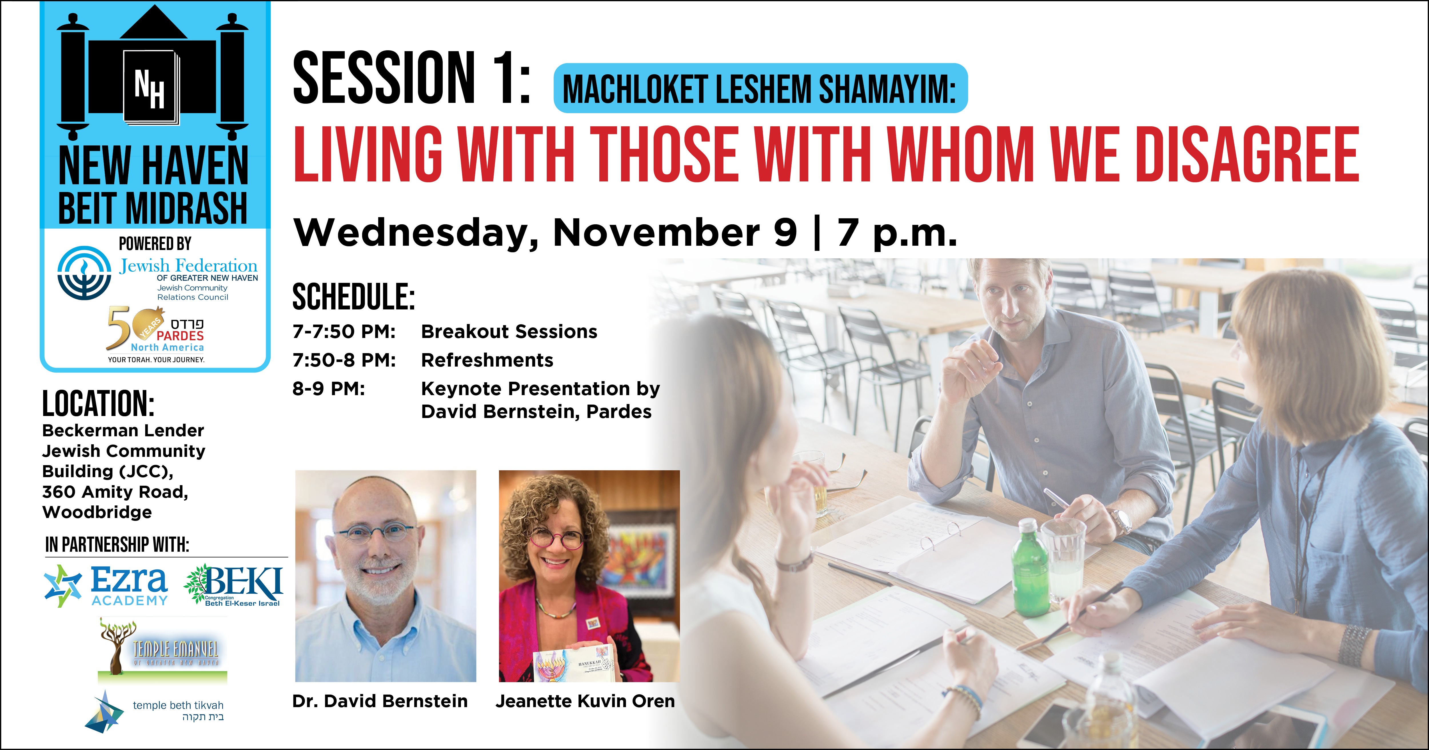 Join Dr. David Bernstein, the Dean Emeritus of the Pardes Institute for Jewish Studies, for our first New Haven Beit Midrash program, titled "Machloket Leshem Shamayim: Living With Those With Whom We Disagree." Falling as it does in the wake of the American midterm elections, the theme for this evening's learning will be constructive conflict and communication across different opinions.