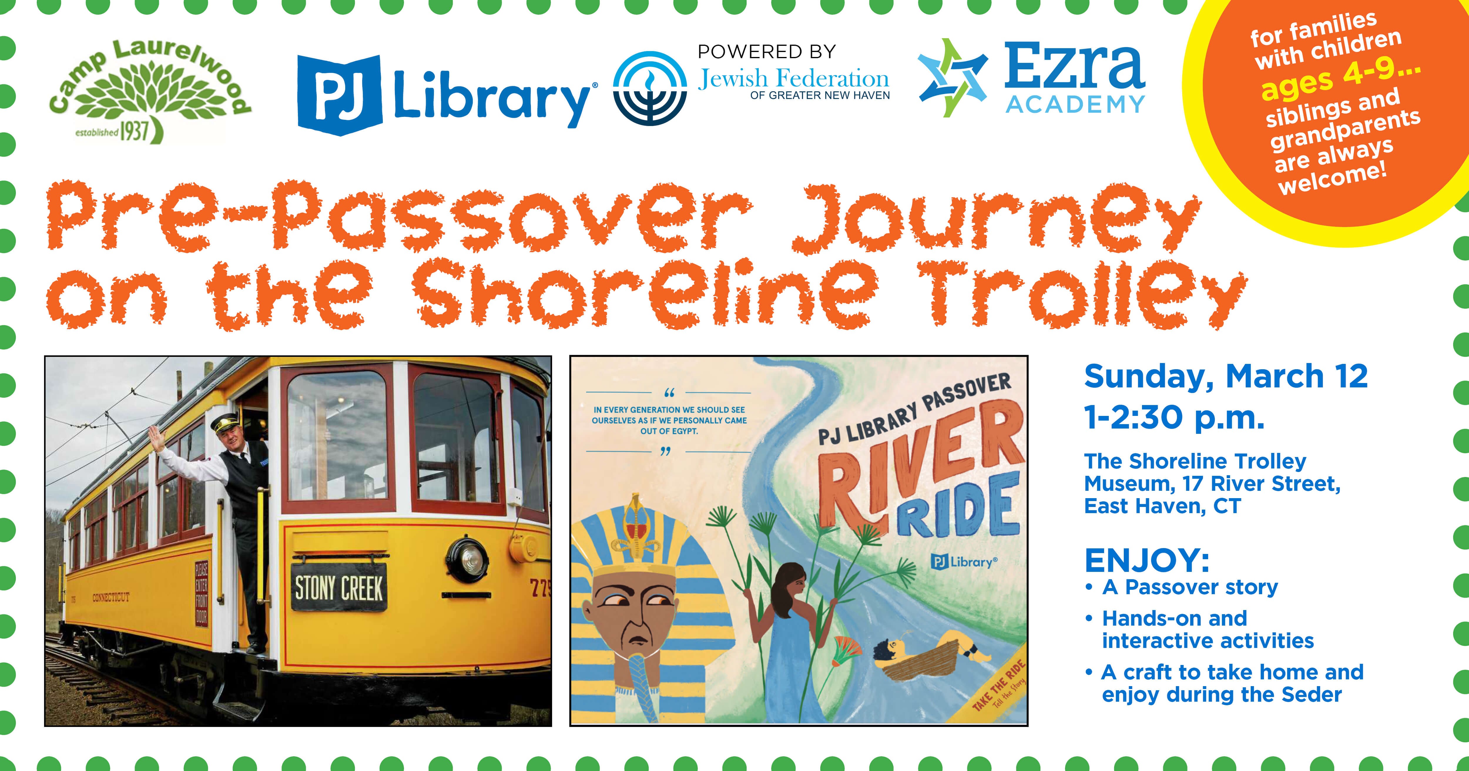 Join Camp Laurelwood, Ezra Academy & PJ Library for a pre-Passover journey. Take a trolley ride with us to learn the Passover story with multiple hands-on and interactive activities and a craft to take home and enjoy during the Seder.