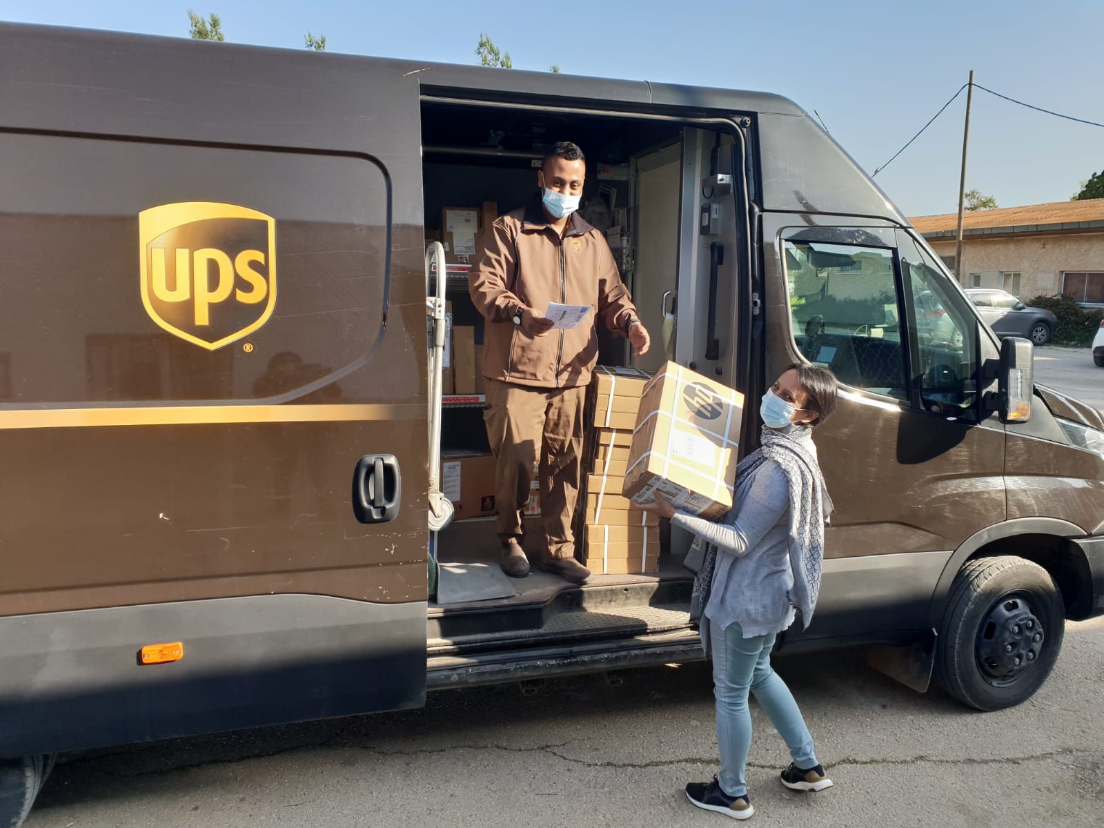 Pictured below: a staff person from the absorption center accepts the laptops from a UPS driver.