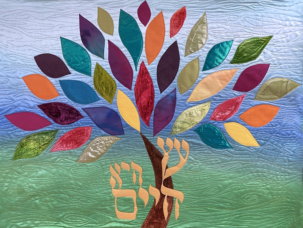 The mantle of this Torah, however, was noticeably worn. Such a beautifully written scroll deserves a fine cover, and so, wanting to thank Rabbi Greene for his generosity, I offered to purchase a new cover for the Torah. Asked if he wanted something special, Rabbi Greene replied that he would like the image of a tree, representing the logo of Camp Laurelwood, to decorate the cover. He got in touch with the artist Jeanette Kuven Oren, who came up with a design that honored the Torah and was fitting for the camp: a tree bursting with vibrant, colorful leaves and the words Etz Chaim Hi floating across its trunk. We loved it!