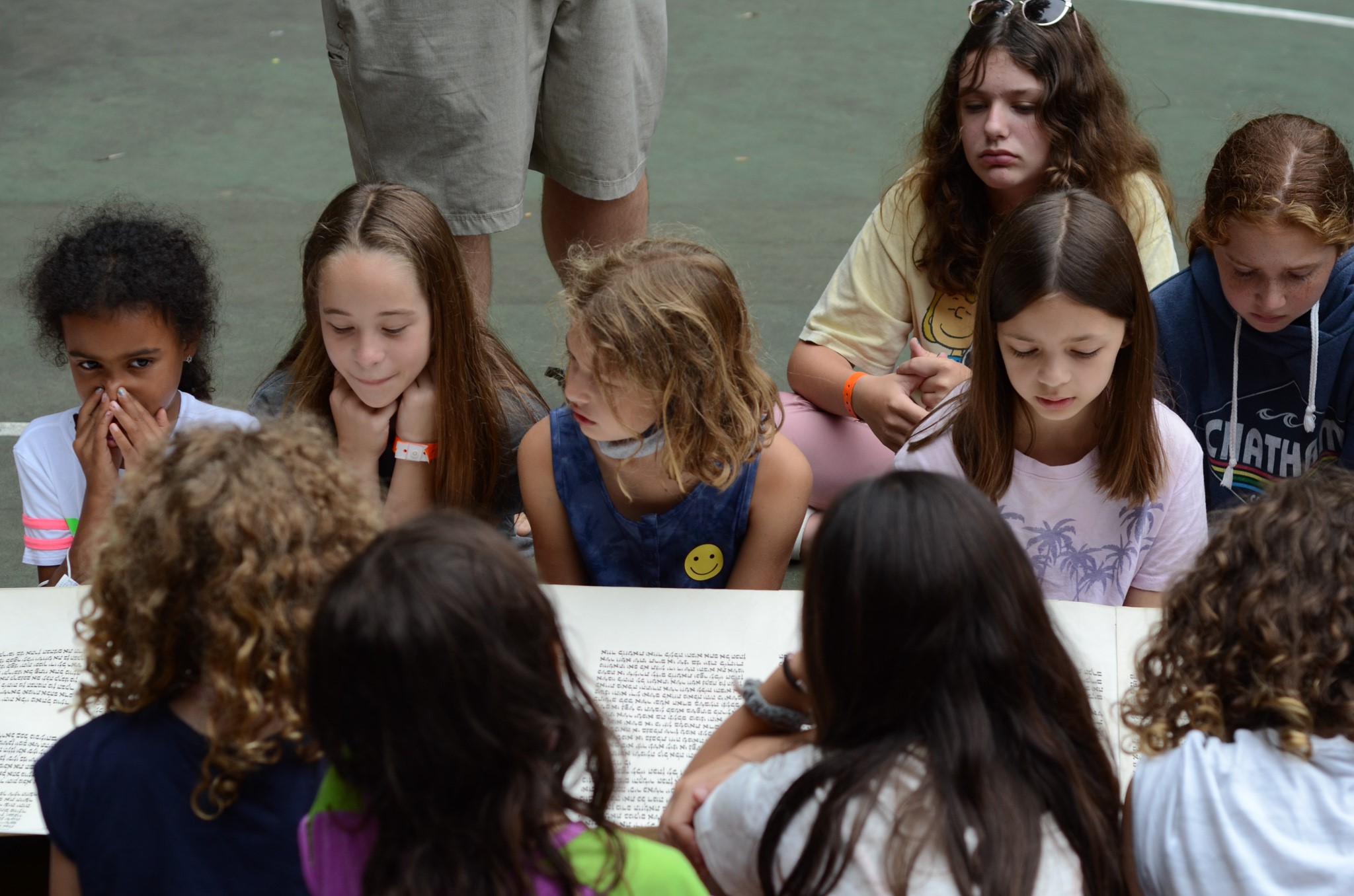 “We created a ritual where our cornerstone fellows (third-year counselors who were all campers at Laurelwood) help us unroll the scroll. We asked our campers to get into two lines and then sit down, and we unrolled the scroll on top of them, so their legs were supporting the scroll. We stretched across an entire basketball court at our Chuppah. We asked the campers and counselors to look for things in the scroll that were noticeable - crowns on the letters, breaks in the writing, letters of different sizes. It gave us a chance to talk about the journey of our ancestors was full of differences, and how those differences make the scroll special, just as our differences make our Camp community whole and special. We also talked about how the journey of our ancestors supports the community we are today, just as we are supporting the scroll with our bodies. We made a sheheheyanu, read from it, and sang some Torah songs led by one of our new counselors, Jessica. It was such a special moment, and would not have been possible without the help and support of the Jewish Foundation of Greater New Haven,” states Rabbi James Green, Camp Laurelwood Executive Director.