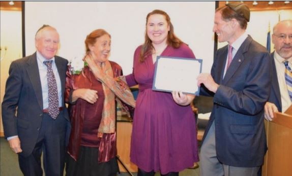 On Nov. 5, Congregation Or Shalom in Orange honored Marion Pritchard at the synagogue’s annual Kristallnacht commemoration. Pritchard, who passed away in December 2016, was involved in the rescue of over 150 Jewish children in Holland during WWII. From left to right: Brian Pritchard (Marion’s son), Erica Polak (raised by Marion in hiding), Marion Pritchard (Marion’s granddaughter), Senator Richard Blumenthal and Rabbi Alvin Wainhaus.