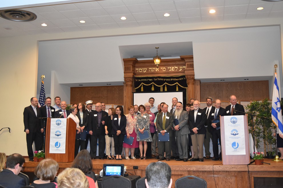 At its Annual Meeting on Wednesday June 7, the Jewish Federation of Greater New Haven honored the Woodbridge Volunteer Fire Department, Woodbridge Police Department, Ellen Scalettar, First Selectman, and Terry Gilbertson, Town of Woodbridge Building Official, as well as community volunteers, area synagogues and Jewish agencies with the Robert Eisner Community Service Award.