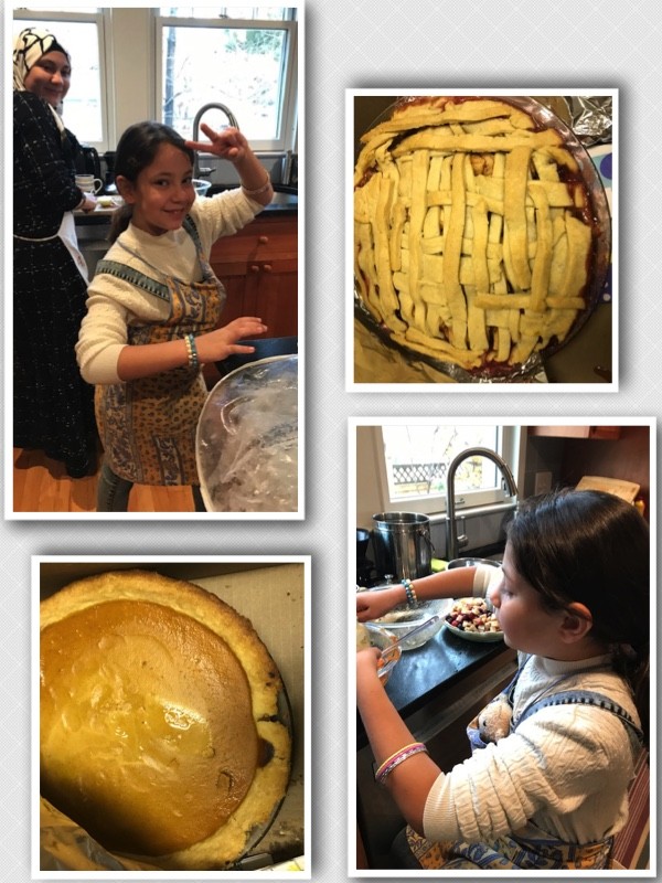 Celebrating a holiday for the first time in a new culture can be daunting. When JCARR’s Family 9 said they would like to make a Thanksgiving dinner – less than a month after they arrived in the United States – volunteers made it easier for them. One person provided a Halal turkey; another explained the traditional side dishes; they chose options that appealed most to them – rice instead of mashed potatoes, for example. The three daughters surprised us, though, when we invited them to learn to make Thanksgiving pies, and they turned out to be whizzes. As the photos show, they made apple/cranberry and pumpkin pies, which turned out perfectly!