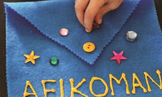 This no-sew bag will get kids excited for the afikoman hunt during the Seder. Use a rectangular piece of felt, 11.5″ x 16″, and fold up the bottom half, leaving a piece at the top, like an envelope flap. Seal the edges with craft glue or a hot glue gun. Cut the remaining flap to form a “v” shape (see below). Kids can decorate using puffy paint, buttons and sequins.