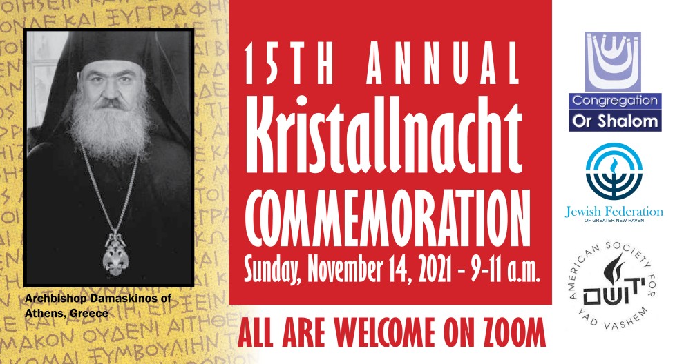 All are invited to a community-wide Kristallnacht Commemoration to be held 9 a.m. – 11 a.m. on Sunday, November 14. This year’s Commemoration, presented by Congregation Or Shalom in Orange, in partnership with the Jewish Federation of Greater New Haven and with support by the American Society for Yad Vashem, will honor the heroism of Archbishop Damaskinos of Athens. The program is free of charge. Kindly register at www.jewishnewhaven.org/kristallnacht