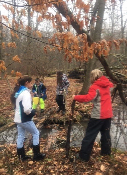 We begin each outdoor time with a niggun and blessing. We kicked off the year by allowing the students to become comfortable in the woods – realizing that quite literally, some students had never walked on an unmarked path. We then tied the outside time into the month of Elul and new beginnings. “At first I was nervous about Teva Tuesday because of bees and cold weather. Now I like it a lot because I like being in the rain and stomping in the water. I like trying to build things like our shaduf, even though it didn’t exactly work,” said student Dani Brandt.