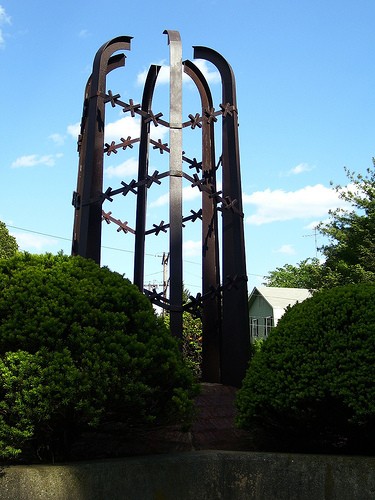 Buried at the center of New Haven’s Holocaust Memorial is a shoebox of ashes collected from Aushwitz Birkenau. The shoebox is surrounded by a concrete Star of David that forms the base of the memorial. Surrounding the center are curved, metal beams with symbolic barbed wire that represent Jewish imprisonment. Six center yew trees memorialize the six million Jews who were murdered. Eighteen plaques, symbolizing the 18 different concentration camps, surround the memorial. Two bushes, whose planters are adorned with plaques, sit close to the memorial to honor the rescuers and others who died at the hands of the Nazis.