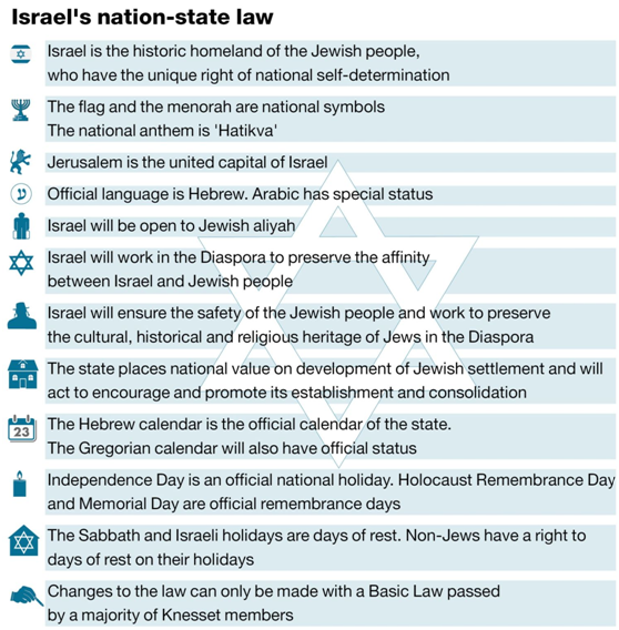 The new law enshrines in legislation Israel’s status as the nation state of the Jewish people. The first clause lays down ‘basic principles’ about Israel as a Jewish homeland. The law also contains several other short clauses about: state emblems, the nation’s capital (already enshrined in Basic Law: Jerusalem), “preservation of heritage,” ingathering of exiles, relationship with the Diaspora, language, official calendar, national holidays and days of rest. The last clause requires that an ‘absolute majority’ of MKs approve later changes to the bill, which is common with regard to basic laws.